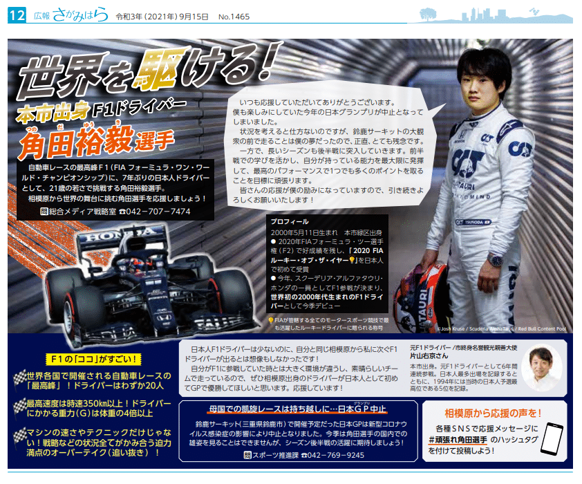 また、市の広報でも角田裕毅の活躍は大きく取り上げられており、その紙面からは並々ならぬこだわりと熱意が伝わってくる。