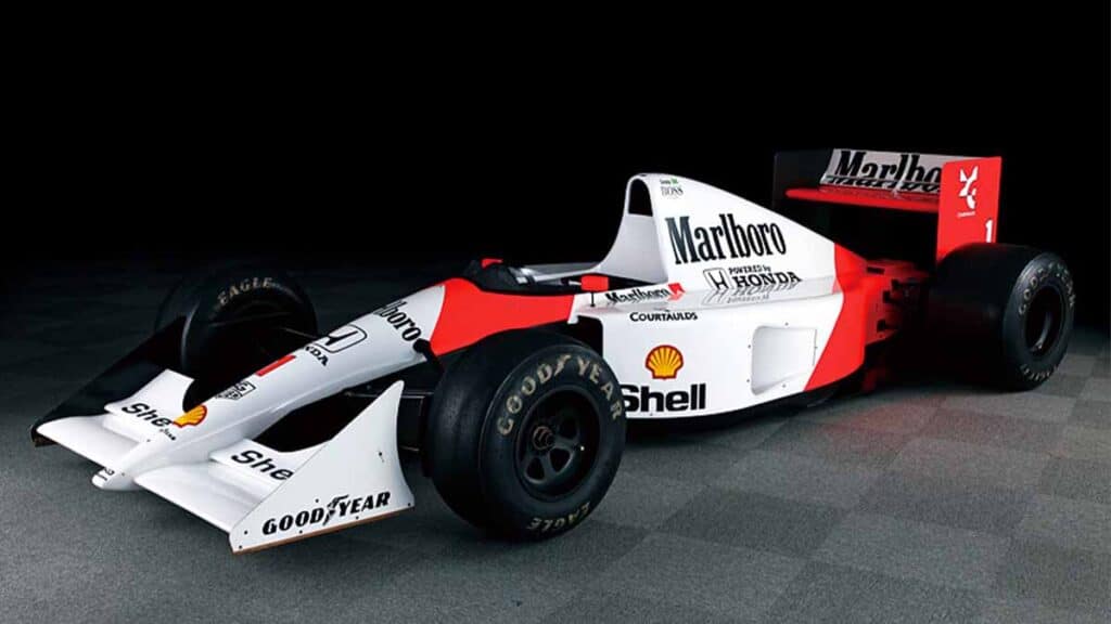 1991年、アイルトン・セナとゲルハルト・ベルガーのコンビでドライバーズ&コンストラクターズのダブルタイトルを獲得したMcLaren Honda MP4/6だ。3.5リッター自然吸気V12「RA121E」のエンジン始動が行われ、ターボ時代とは異なる、ホンダF1のもう一つの黄金期のサウンドが会場に響く。