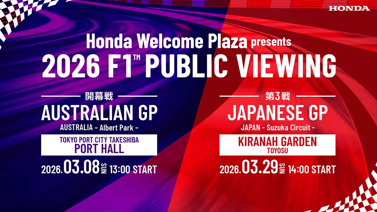 2026年シーズンの開幕を前に、Honda Welcome Plazaが、オーストラリアGP(3月8日)及び日本GP(3月29日)決勝レースのパブリックビューイングイベントを開催することを発表した。世界最高峰のモータースポーツを大画面で楽しめる、F1ファン必見のイベントとなっている。入場は無料で、事前抽選制の座席指定席に加え、当日参加可能なフリー観覧エリアも用意される。