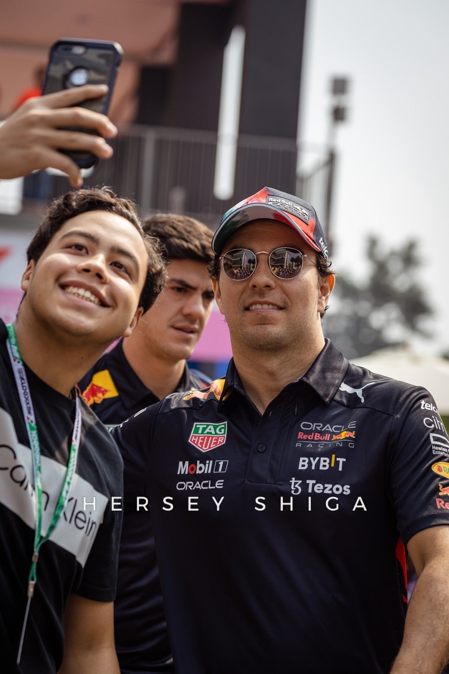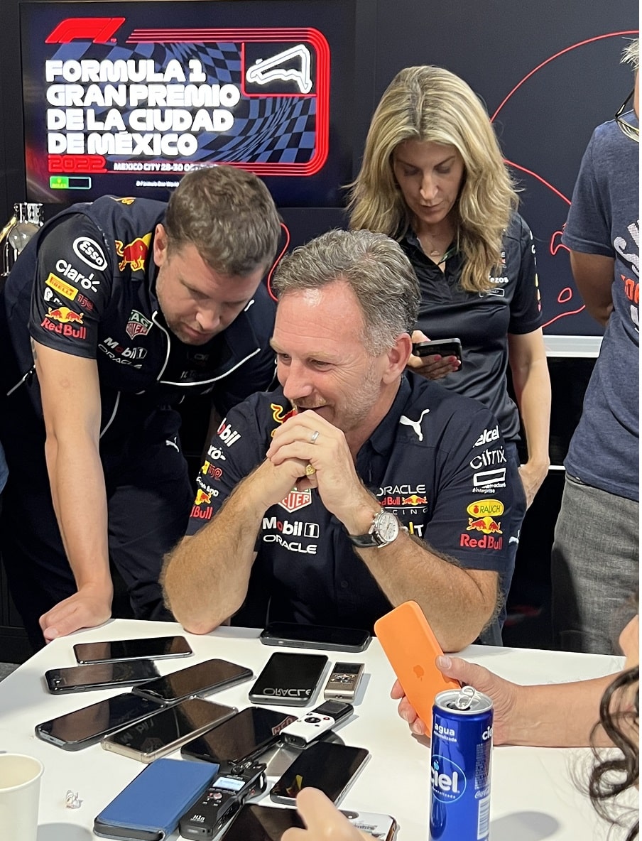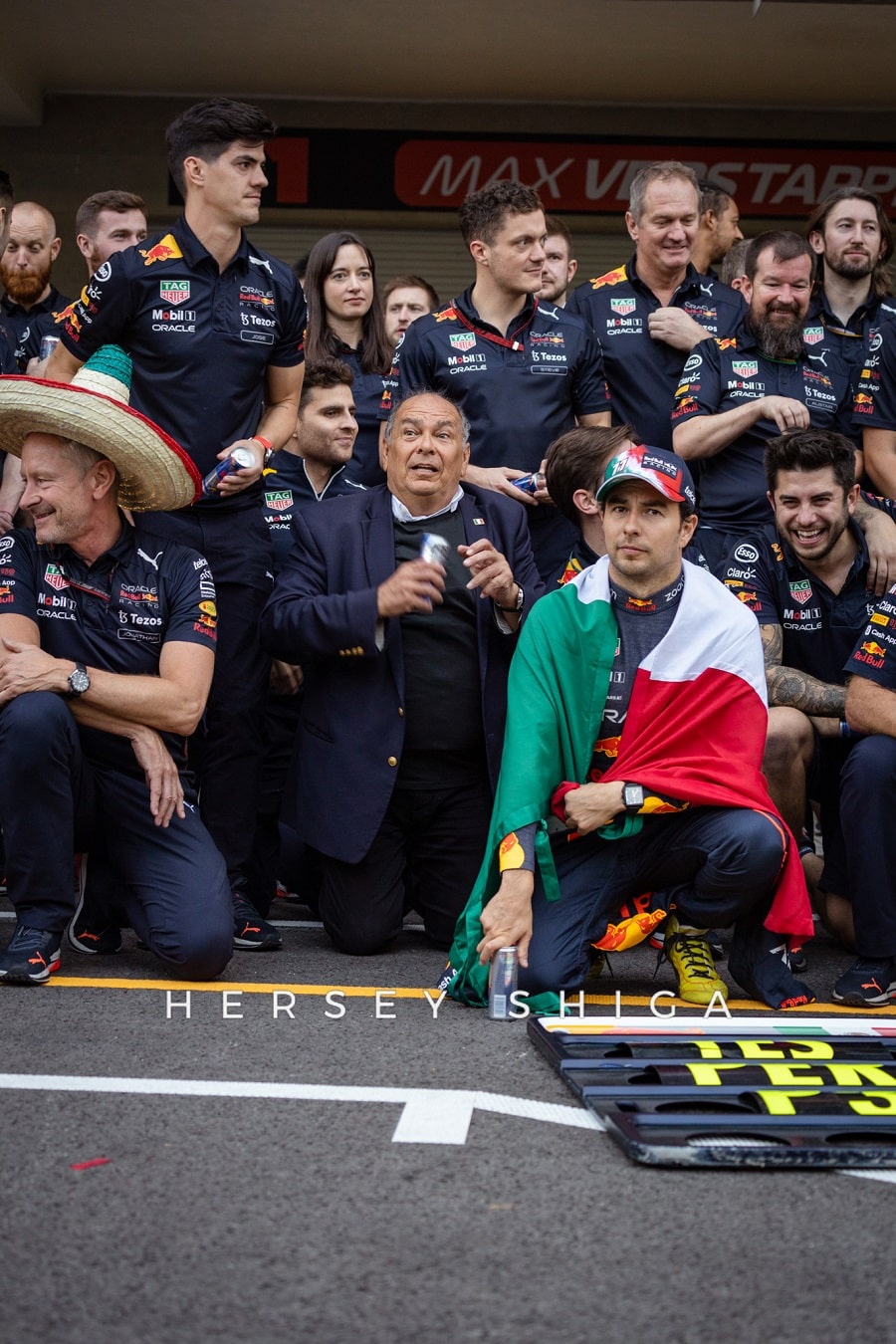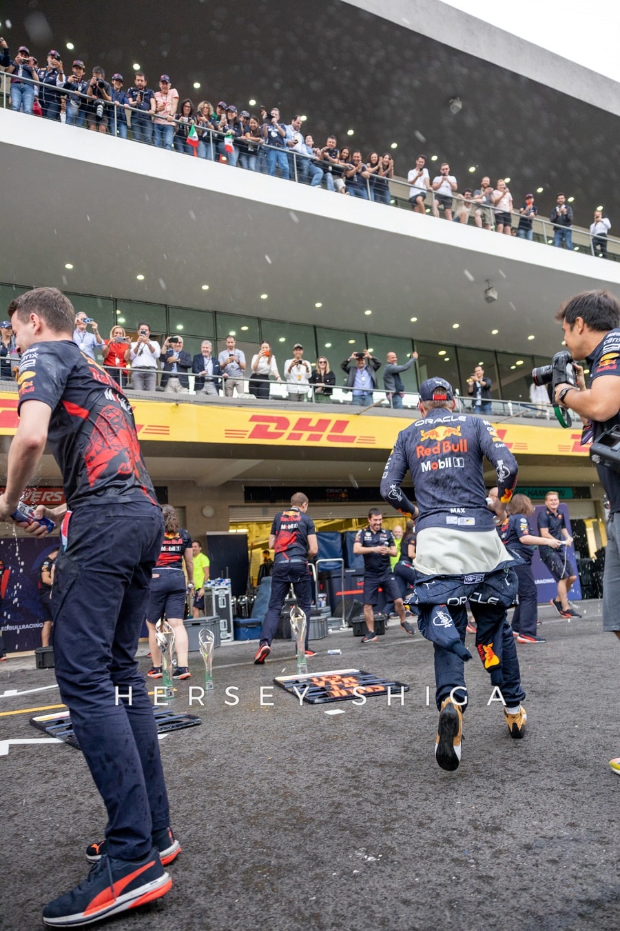 レース後の記者会見終了後に、レッドブルのドライバーたちは恒例のチームフォトセッションに移動。私たちハーシー・シガのカメラマンも中央に位置し、”レッドブル”シャワーを浴びることに。カメラマンは撮影機材が濡れてベタベタになってしまい残念そうです。レッドブルチーム、そしてマックスと”チェコ”・ペレスにとって素晴らしいレースとなりました。