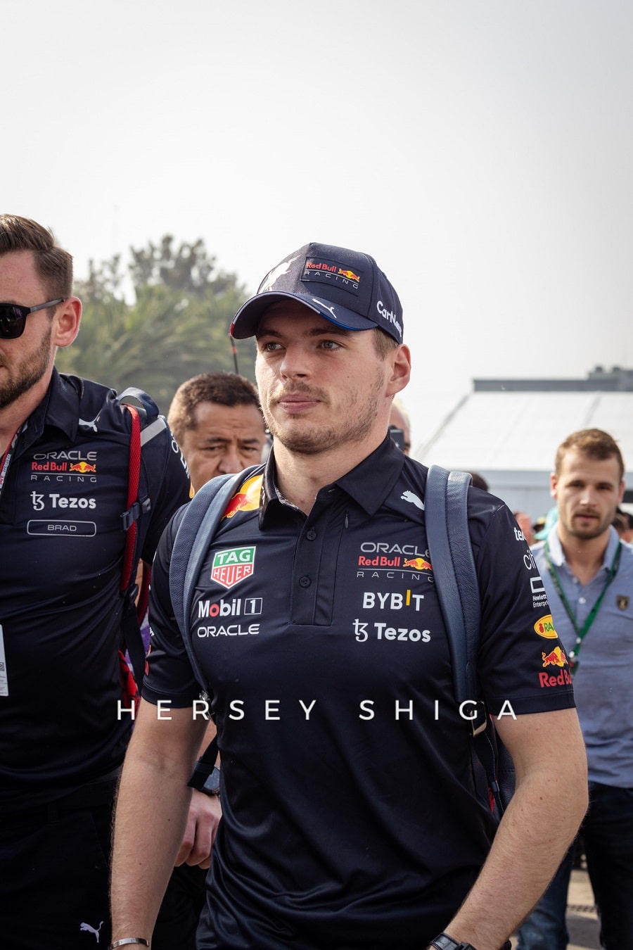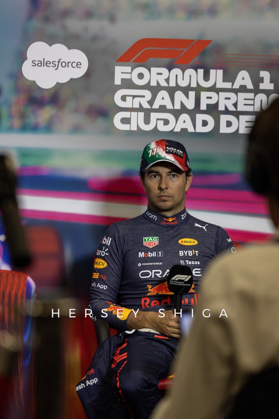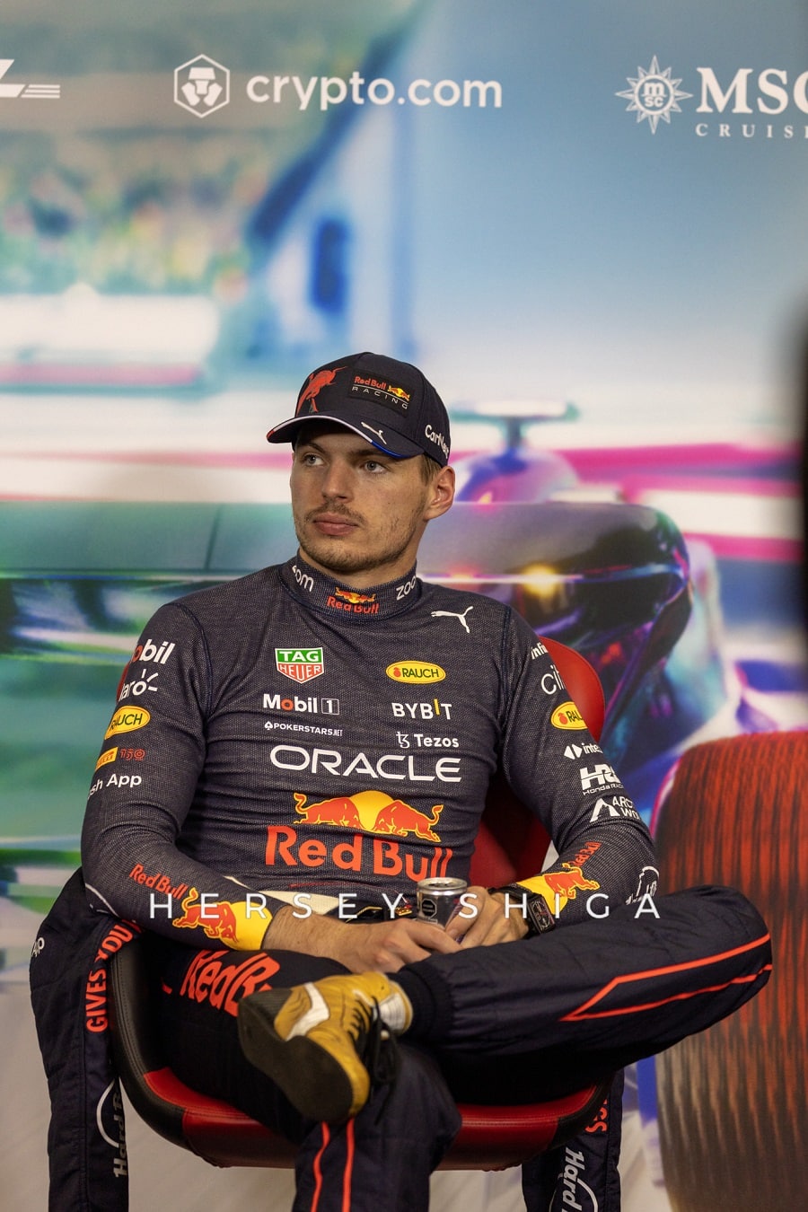 レース後の記者会見終了後に、レッドブルのドライバーたちは恒例のチームフォトセッションに移動。私たちハーシー・シガのカメラマンも中央に位置し、”レッドブル”シャワーを浴びることに。カメラマンは撮影機材が濡れてベタベタになってしまい残念そうです。レッドブルチーム、そしてマックスと”チェコ”・ペレスにとって素晴らしいレースとなりました。