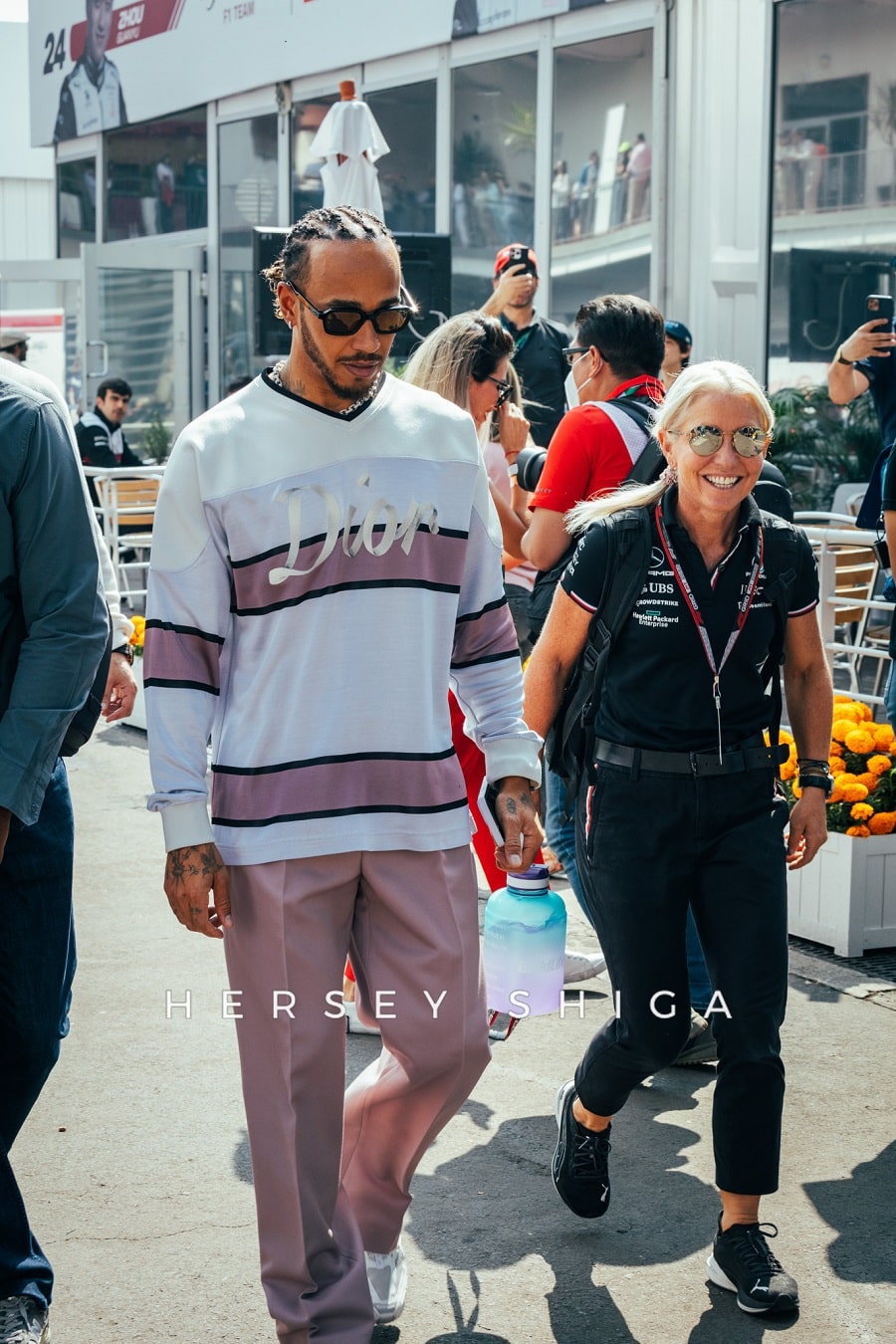 角田もいつも通り早めの入場。今日はライトピンクのアルファタウリ・スウェットシャツを着用。このスウェットシャツはアルファタウリのウェアの中でもお気に入りのアイテムだと、角田本人がツイートしています。ファンサービスに時間を割き、写真撮影にも対応してくれました。ファンサービスは角田以外のドライバーもしっかりと対応。特にシャルル・ルクレールはじっくり時間を取って、ファンとも親しげに交流。F1界のファッションエキスパートであるハミルトンは今日もお洒落なディオールのトップスで、フィジオのアンジェラ・カレンと共に入場。